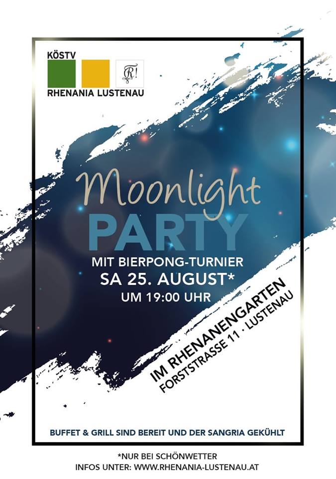 Und wieder einmal machte uns das Wetter einen Strich durch die Rechnung. Zum dritten Mal in Folge mussten wir auch heuer unsere alljährliche in den Sommerferien abgehaltene Moonlightparty aufgrund leichten Nieselregens ins Innere der Bude verlegen. Statt im Rhenanengarten ging das für diesen Abend geplante Beer-Pong-Turnier im Chargenzimmer über die Bühne, was dem Spaß aber keinen Abbruch tat. Acht Zweier-Teams stellten sich der Herausforderung, Treffsicherheit und Wurfglück mit Trinkfestigkeit perfekt zu kombinieren. Nach feuchtfröhlichem Kampf siegte Team 4Bier/Arthus vor Niggo/Dominic und Kaleo/Ketchup. Für das leibliche Wohl sorgte wie üblich die Aktivitas mit leckeren Salaten, Snacks und pikantem wie auch süßem Gebäck sowie Bundesbruder Arthus, der auf dem Balkon diverse Grilladen auf den Rost schmiss.